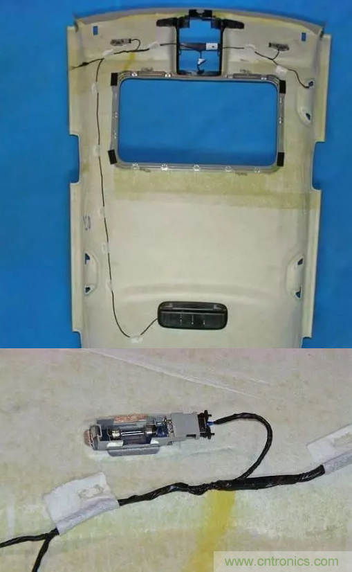 高爾夫的頂棚線(xiàn)束包扎設(shè)計(jì)方案為膠帶黏粘到頂棚上進(jìn)行固定,如下圖所示。