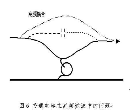 在實際工程中,要濾除的電磁噪聲頻率往往高達數百MHz,甚至超過1GHz。對這樣高頻的電磁噪聲必須使用穿心電容才能有效地濾除。普通電容之所以不能有效地濾除高頻噪聲,是因為兩個原因,一個原因是電容引線電感造成電容諧振,對高頻信號呈現較大的阻抗,削弱了對高頻信號的旁路作用;另一個原因是導線之間的寄生電容使高頻信號發生耦合,降低了濾波效果,如圖5所示。