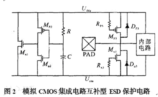 數字電路一般采用兩級保護電路,并且在主保護電路和次保護電路中串聯一個限流電阻,而大的限流電阻和ESD 鉗位器件的節電容會產生一個大的RC 延遲,因此,不適合應用于高速模擬CMOS集成電路中。