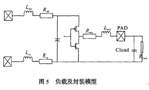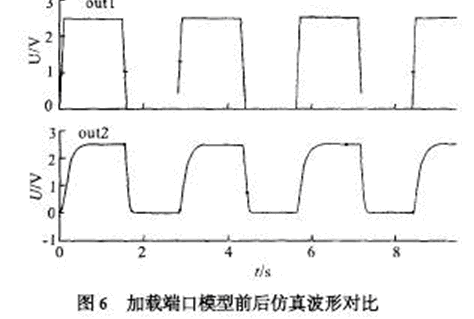 由于ESD 保護電路以及封裝所帶來的寄生電容和寄生電感對原有輸出信號會有影響,尤其是在高速模擬電路中,頻率越高信號畸變越嚴重,所以建立合適的仿真模型并進行有效的仿真是必須的。信號一般經過驅動, ESD 保護,和封裝引線才能傳到芯片外的負載上,封裝的模型根據選用的封裝形式和廠家提供的參數決定。 一般IC 封裝會給出端口的寄生電容,電阻和電感,其等效模型如圖5所示。 將該模型與前面的ESD 保護電路(圖3) 串連起來就可以得到端口模型, 可用spice 對用于USB2.0 的環境,在480 MHz 頻率下的收發電路進行仿真,其仿真波形如圖6 所示。 輸出端口out1 是不考慮端口模型的影響,480 MHz 時鐘的輸出較為理想,out2 是加入端口模型后的時鐘輸出,波形有所畸變,但仍能滿足電路設計要求。