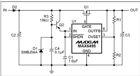 過壓保護(hù)(OVP)器件數(shù)據(jù)資料中提供的典型電路可以滿足大多數(shù)應(yīng)用的需求(圖1)。然而,有些應(yīng)用需要對基本電路進(jìn)行適當(dāng)修改。本文討論了兩種類似應(yīng)用:增大電路的最大輸入電壓,在過壓情況發(fā)生時利用輸出電容存儲能量。