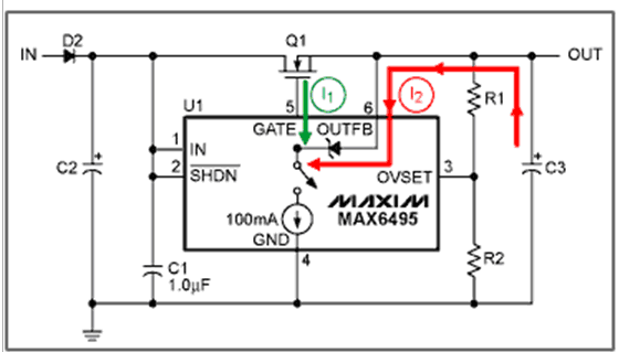 MAX6495–MAX6499/MAX6397/MAX6398通過內(nèi)部100mA的電流源(見圖4)連接到GATE輸出,以對柵極電容和輸出電容放電。電流源先對GATE放電(電流I1,綠色箭頭),直到GATE的電壓等于OUTFB電壓,然后斷開FET,電流源繼續(xù)降低GATE電壓,最后,直到內(nèi)部的箝位二極管變?yōu)檎蚱茫瑢敵鲭娙莘烹?電流I2,紅色箭頭)。