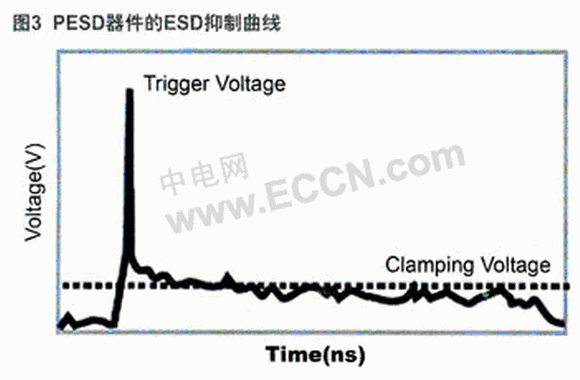 為滿足高速數(shù)據(jù)通訊接口既ESD保護(hù)有效、又不影響高速信號傳輸?shù)囊蟆=陙恚袌錾贤瞥隽硕喾N專門適用于此類保護(hù)要求的器件。其中以瑞侃電路保護(hù)部門(RCP:RaychemCircuit Protection)推出的PESD器件為代表。該器件的電容極低(通常0.25pF),漏電流極小(<0.001 A);ESD防護(hù)快速有效(響應(yīng)曲線如圖3所示,觸發(fā)電壓典型值為150~250V;響應(yīng)時間少于1 ns);價格低于低電容硅器件。因此,在高速數(shù)據(jù)傳輸條件下,PESD器件擁有更佳的保護(hù)應(yīng)用特性。該器件已成功應(yīng)用于HDMI1.3和USB2.0等多種高速接口電路。