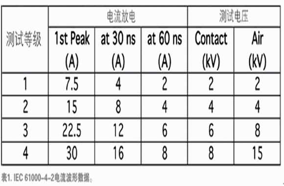 目前最常用的ESD抗擾度標(biāo)準(zhǔn)是IEC 61000-4-2標(biāo)準(zhǔn)。該系統(tǒng)級(jí)標(biāo)準(zhǔn)規(guī)定了一個(gè)源極模型,后者包含一個(gè)150pF電荷存儲(chǔ)器(在330 ohm源極電阻后面)和一個(gè)特定的電流放電波形(圖1和表1)。與舊標(biāo)準(zhǔn)規(guī)定的源極相比,大電荷存儲(chǔ)器和低源極電阻使源極模型能交付更多能量和更大電流。