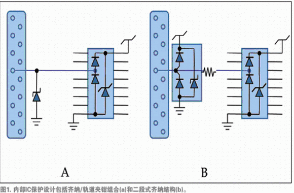 例如,與信號輸入相關的IC焊墊的特點是齊納二極管和結型鉗位二極管連接供電軌(圖1a),或者兩段式齊納鉗位二級管連接地面(圖1b)。多供電軌的IC需要使用軌道夾鉗阻止軌道在高速電流瞬變時擴散。