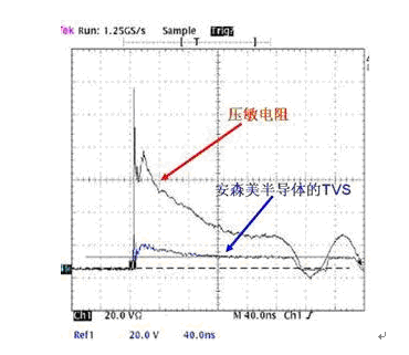 圖3: TVS元件與壓敏電阻在8kV IEC 61000-4-2應(yīng)力沖擊測試下的輸出波形對比