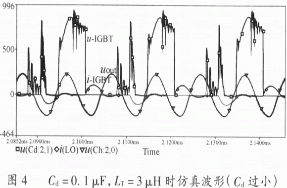 從減小短路電流的角度看,Cd要盡可能小,LT要盡可能大。但Cd過小,電路工作時存在以下缺點:隔直效果不理想;輸出電壓正弦失真度過高,輸出電壓降低,加熱效果不理想;反并二極管重新導通,增加二極管的電流容量,如圖4所示。
