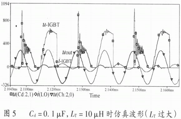 當LT過大時,電路工作時存在以下缺點:LT上的高頻壓降過高,使得輸出電壓降低;管子關斷時承受的正向阻斷電壓升高;內槽路諧振頻率減小,IGBT和二極管出現二次導通,如圖5所示。
