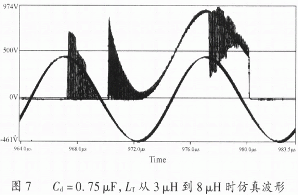 圖6是LT/Cd=4,Cd=0.75μF,LT=3μH時的仿真波形,通過與圖4和圖5的對比可以看出,此時參數選擇最為合適。