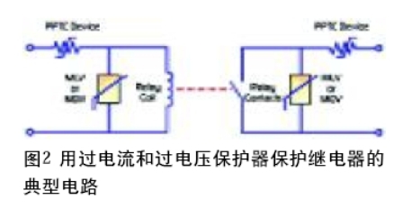 圖2是保護繼電器的一種典型電路。PPTC保護器是是與繼電器繞組串聯著,在出現故障或者發生意外的過載時,它限制繼電器中流過的電流。這個圖中,還有一個 PPTC保護器與繼電器的觸點串聯著,它起的作用與保護繼電器繞組是一樣的。在選擇PPTC保護器時,很重要一點是它的額定電壓要等于或高于預期的最高電壓。還要求保護器的保持電流必須等于或大于正常運作時的最大穩定狀態電流。此外,還要考慮到最高環境溫度,這是因為隨著環境溫度上升,保持電流下降。