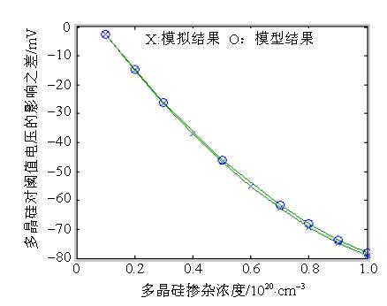 圖4給出了不同的多晶硅摻雜下,考慮多晶硅量子效應相對于只考慮體硅量子效應時MOSFET閾值電壓偏移的數值模擬結果與本文的模型結果。圖中體硅摻雜濃度為