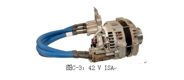用于中型混合動力系統的ISG(集成式起動機/發電機),輕型汽車為14 V,120 A,而在制動和停車期間沒有燃料噴射時,空轉引擎為42 V,60至80 A輸出。