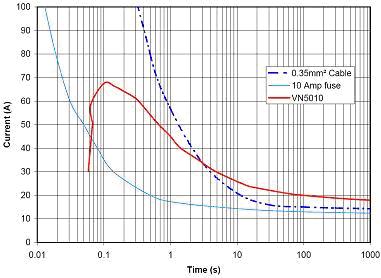 在圖5的示例中有一個(gè)點(diǎn),智能開關(guān) (VN5010)將繼續(xù)前行,而電線將開始自毀(紅線在藍(lán)色虛線上方)。如果這種情況是真實(shí)的,甚至連電路板都可能會(huì)自毀?,F(xiàn)在考慮到涌流要求很可能更加嚴(yán)格,我們開始意識(shí)到有必要開發(fā)一個(gè)能夠仿真熔斷器特性的保護(hù)算法。