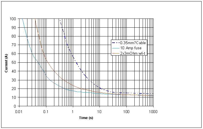 圖10:采用保護(hù)算法的外推i2-t曲線與電線和熔斷器比較