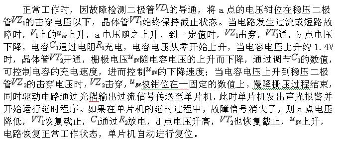 這與傳統(tǒng)的簡(jiǎn)單限流或直接關(guān)閉IGBT的控制方式有本質(zhì)的區(qū)別,它是利用單片機(jī)的智能性改變其工作方式來(lái)保護(hù)IGBT的安全,從而可靠的保證IGBT的安全。