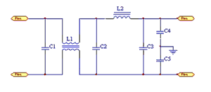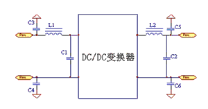 為了抑制外來的高頻干擾,也為了抑制DC/DC變換器對(duì)外傳導(dǎo)干擾,通過在DC/DC變換器的輸入端、輸出端設(shè)計(jì)濾波電路,抑制共模、差模干擾,降低EMI電平。其中,C1、C2、C3為差模濾波電容,C4、C5為共模濾波電容,L1為共模扼流圈,L2為差模濾波電感。