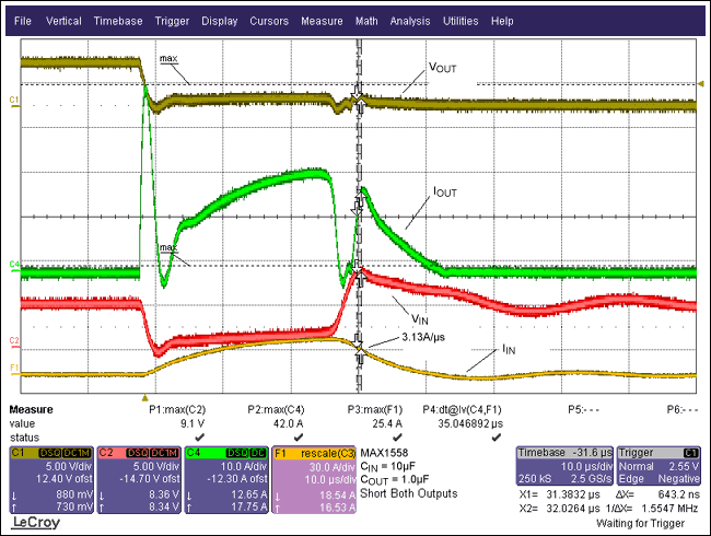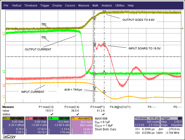 圖2.波形顯示了具有10µFCBYPASS情況下的短路響應(yīng),從VIN波形可以看出:由于電流變化使得輸入電壓上沖到了8.6V。
