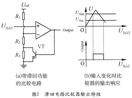但如果在比較電路中設置兩個門限電壓:UTHH和UTHL(UTHH>UTHL),則可以形成一個滯回區,如圖1(b)所示。當電池電壓從低升高至UTHH時,比較器輸出高電平,打開電子開關,給負載供電;當電池電壓降低至UTHL時,比較器輸出低電平,斷開負載。這個時候電池端電壓雖然會迅速升高至UTHL以上,但由于達不到UTHH,所以,比較器仍然輸出低電平,負載仍被斷開,直到電池被充電后電壓升高至UTHH以上才能再次接通負載。這樣就避免了電路的振蕩,保護了負載和電池。