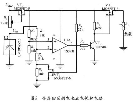 圖3是具體的硬件電路圖,參考電壓由LM285Z一2.5分流穩壓器產生,它最低只需要10μA的通過電流就可輸出穩定的2.5V參考電壓,這可大大降低電池在低壓閉鎖狀態的功耗。比較器選用了ST公司TS393I,它是一種微功耗比較器,這樣,所有分壓電阻的阻值可以選的很大,進一步降低了功耗。比較器的輸出控制P溝道的MOSFET、VT3接通或斷開負載。當電池電壓降低到一定程度時VT2關斷,使得由比較器組成的保護電路與電池斷開,極大地減小的電池的能量消耗,電池處于一種近似自然放電的狀態;當電池電壓恢復時,VT2自然導通,保護電路重新恢復工作。