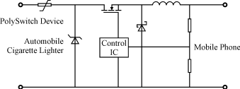 2)轉(zhuǎn)換器發(fā)生故障時(shí)的汽車電路保護(hù)如果轉(zhuǎn)換器或控制IC失效,短路電流會(huì)使PPTC動(dòng)作跳變至高阻狀態(tài),以保護(hù)汽車的線路及保險(xiǎn)絲。