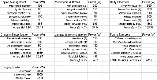 關(guān)于該表要注意的最后一點(diǎn)是:如果考慮車身電子、照明和底盤電子等子系統(tǒng)的間歇性負(fù)載,對汽車充電系統(tǒng)的需求就真的是附件超載(accessoryoverload)。將來的系統(tǒng)將持續(xù)這種趨勢。