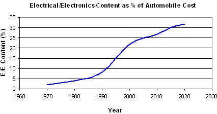汽車電子和電器設(shè)備以平均每輛車每年超過110W的速度遞增,最近,過去由機(jī)械力和液壓力推動(dòng)的系統(tǒng)都改由電力驅(qū)動(dòng),對電能的大部分需求都源于此。上世紀(jì)80年代出現(xiàn)的防抱死剎車系統(tǒng)(ABS)具有存儲容量大約為8KB電子控制單元;而現(xiàn)代的第五代ABS硬件配備128KB的存儲器,大小僅僅為早期系統(tǒng)的40%。由于設(shè)計(jì)精巧和創(chuàng)新,現(xiàn)代電氣/電子系統(tǒng)對功率的要求通常比最初推出的系統(tǒng)要小。