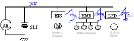 在這個(gè)高度簡化的描述中,超級電容分布模塊或雙層電容(DLC)緊靠高耗能用電負(fù)載,如EPS(1.2KW)、電子機(jī)械剎車(1到2KW)和新型照明系統(tǒng)(如最近出現(xiàn)的白光LED頭燈)。本地分布式模塊為高峰負(fù)載供電,避免造成來自交流發(fā)電機(jī)和電池的14V電源線出現(xiàn)強(qiáng)烈的波動(dòng)。
