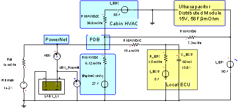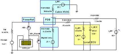 在上圖中,汽車充電系統(tǒng)由交流發(fā)電機(jī)和鉛酸電池來表示。在這種情況下,要利用Ansoft公司的汽車工具箱之中的Simplorer電化學(xué)建模工具對電池進(jìn)行比較詳細(xì)的建模。PowerNet被高度簡化為由線規(guī)電阻建模的四個(gè)分支電路,包括引擎控制、車箱氣候控制、本地ECU和EPS(最右邊)。PowerNet分配點(diǎn)被標(biāo)注為PDB或電力分配箱。