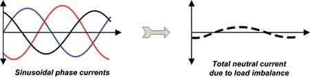 所有中性導線都并入配電板中的一個大直徑中性導線,就像一個變壓器一樣(見圖5)。在線性負載情況下,多相位系統的中性電流在一定程度上相互抵消。由于負載不平衡(見圖3),只有總中性電流的一小部分保留了下來。