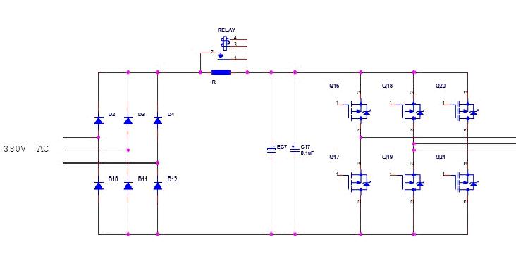 大家可以看出圖上標(biāo)出15KW的地方,就是我們的繼電器應(yīng)用的地方,一般在15KW以下的變頻器上的保護工作都是由繼電器來完成的,大于15KW的變頻器都是用接觸器來保護的,繼電器主要完成的作用為,大家知道當(dāng)電機啟動會有一個很大的沖擊電流,為了對變頻器進(jìn)行保護,先用繼電器把這個大的沖擊電流擋住,也就是繼電器處于常開狀態(tài),等電流恢復(fù)到正常,繼電器關(guān)閉,把那個電阻短路,所以此處的繼電器一般都是需要電流比較大的,例如omron的G8P型繼電器,由于此處繼電器對電機有比較重要的作用,所以一般客戶都會選擇質(zhì)量較好的繼電器,有用OEG的,有泰科的,也有松川的。如果在15KW以上的變頻器,一般客戶不會選擇用繼電器來保護,由于沖擊電流太大,一般客戶會選擇接觸器來保護,但是接觸器的價格要比繼電器貴的多。還有一個地方,就是變頻器上都會有給客戶留的無源觸點,這個地方會用繼電器當(dāng)開關(guān)使用。