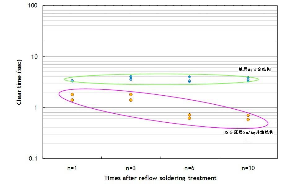 單層Ag合金結(jié)構(gòu)的保險(xiǎn)絲即使經(jīng)過(guò)多次高溫?zé)崽幚恚钥梢跃S持較穩(wěn)定的熔斷時(shí)間。但是雙層Sn/Ag共熔結(jié)構(gòu)的保險(xiǎn)絲,其熔斷時(shí)間有明顯變快的趨勢(shì)。
