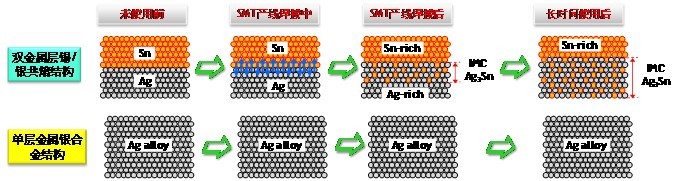 圖7 單金屬層Ag合金結(jié)構(gòu)與雙金屬層Sn/Ag共熔結(jié)構(gòu),在SMT焊接前后及長(zhǎng)時(shí)間使用后的材料與結(jié)構(gòu)變化示意圖。