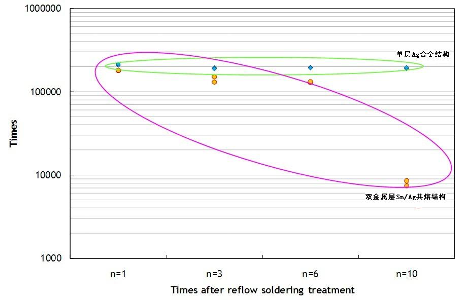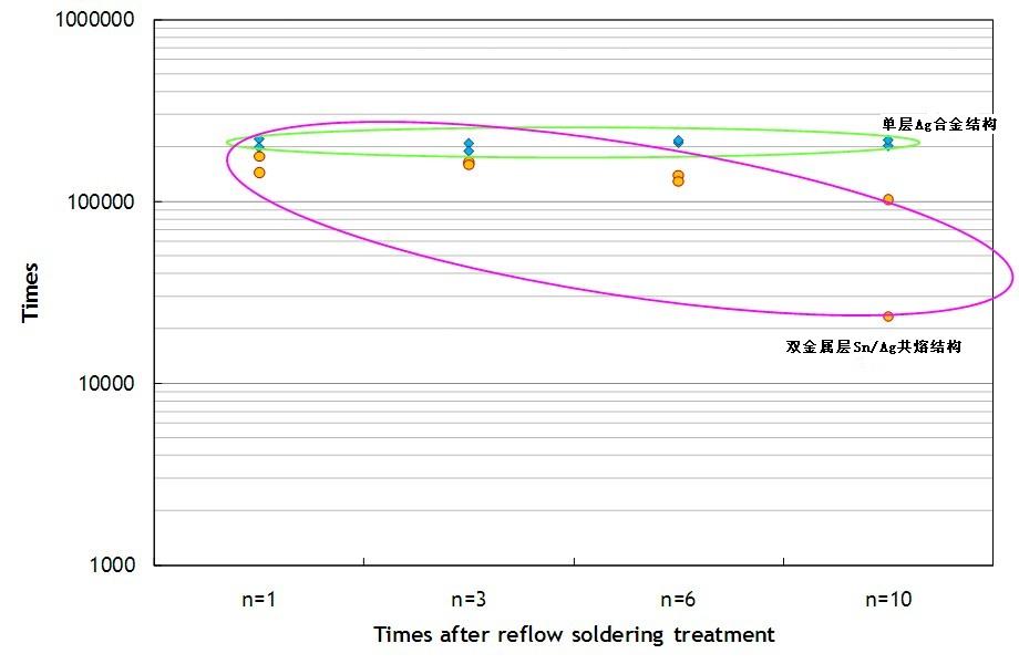 單層Ag合金結(jié)構(gòu)的保險(xiǎn)絲即使經(jīng)過(guò)多次高溫?zé)崽幚恚钥梢跃S持一定的耐脈沖能力,承受脈沖次數(shù)都可達(dá)十萬(wàn)次以上。但是雙層Sn/Ag共熔結(jié)構(gòu)的保險(xiǎn)絲,其承受脈沖能力有明顯下降的趨勢(shì),在經(jīng)過(guò)10次回流焊錫爐熱處理后,承受脈沖次數(shù)就會(huì)下降到十萬(wàn)次以下。