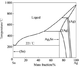 在Sn-Ag二元相圖上(圖1),僅存在兩種Sn-Ag中間金屬化合物(IMC),一是Ag4Sn (ζ相),另一個(gè)是Ag3Sn(ε相)。 在過(guò)去一些學(xué)者如Sen等[2]發(fā)現(xiàn)在氣相沉積Sn/Ag偶在室溫條件下形成Ag3Sn IMC; 另外Arai等[3]發(fā)現(xiàn)在電鍍共沉積Sn-Ag合金中也只形成Ag3Sn金屬化合物。