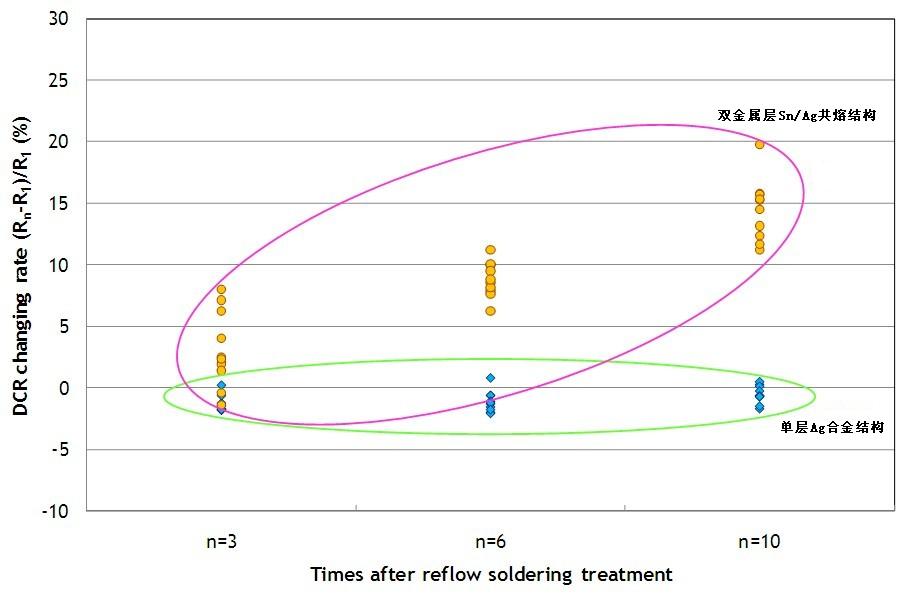 單層Ag合金結(jié)構(gòu)的保險(xiǎn)絲即使經(jīng)過(guò)多次高溫?zé)崽幚恚淅渥杩棺兓苄 5请p層Sn/Ag共熔結(jié)構(gòu)的保險(xiǎn)絲,其冷阻抗有明顯變高的趨勢(shì)(約升高10~20%),且變異也較大。