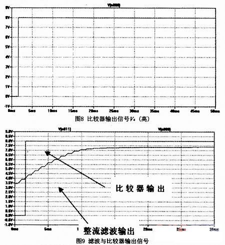 整流濾波后的信號(hào)V2,輸入到比較器IC4的正信號(hào)端,與IC4的負(fù)端電壓(V3=Vcc/2=4V))進(jìn)行比較。當(dāng)信號(hào)電平值大于4V時(shí),比較器輸出高電平(V4接近運(yùn)放的電源8V),當(dāng)信號(hào)電平值小于4V時(shí),比較器輸出低電平(V4接近0V),該兩個(gè)電平將控制后級(jí)檢測電路。圖8為AUX輸入信號(hào)后經(jīng)比較器輸出高電平的仿真輸出,圖9為濾波和比較器的仿真輸出信號(hào)。
