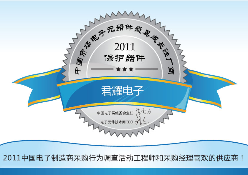 在近日剛剛結束的2011中國電子制造商采購行為調查暨中國市場電子元器件領軍廠商的評選活動中,君耀電子憑借本地化和快速的服務、可靠穩定的產品質量和技術指標等多方面優勢,以及在工程師心目中形成的良好形象,一舉榮獲2011中國市場電子元器件保護器件類最具成長性廠商稱號!