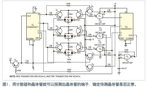 電路使用兩只CD4022或CD4017計數器IC1和IC2;一只單門方波振蕩器G4;以及一個CD4011四與非門,G1至G3。每個測試端子串接一對LED,用于指示電流的方向。LED的顏色直接表示出晶體管的結端。