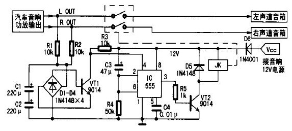1.在接通音響電源的瞬間,因電容C3兩端電壓不能突變,可視為短路,則時基電路555的②、⑥腳電位高于2/3 Vcc,故555處于復位狀態,③腳輸出低電平,晶體管VT2截止,繼電器JK常開觸點不動作。同時+12 V電壓通過電阻R4向電容C3充電,延時約5s(秒鐘)后555的②、⑥腳電位降低至1/3Vcc,555被觸發置位,③腳由低電平變為高電平,晶體管VT2導通,繼電器JK得電,常閉觸點閉合,從而實現了延遲一段時間將揚聲器接入功放,徹底消除了開機時大電流對揚聲器的沖擊;