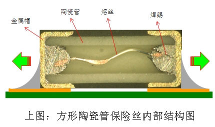 在市場上常見的2410尺寸125Vac或250Vac額定電壓貼片保險(xiǎn)絲, 多是應(yīng)用傳統(tǒng)方形陶瓷管技術(shù)。這一類型貼片保險(xiǎn)絲的兩端是采用金屬帽直接套在方型陶瓷管上, 再以焊錫將金屬帽與內(nèi)部熔絲焊接在一起。一旦產(chǎn)品在高溫的SMT產(chǎn)線上作業(yè),連結(jié)兩端金屬帽與內(nèi)部熔絲的焊錫極有可能會因高溫而再次發(fā)生熔融情形, 進(jìn)而導(dǎo)致金屬帽脫落的風(fēng)險(xiǎn)。