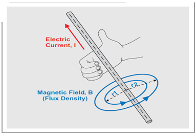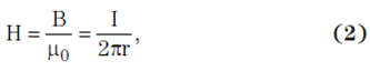 其中,B 為以第平方米伏秒 (V•s/m2) 表示的磁通密度,μ0 為自由空間中的磁導率(計算方法為 4π × 10–7 V•s/A•m),I 為以安培為單位的電流,r 為以米為單位的導體距離,而 H 為以安培每米 (A/m) 為單位的磁場強度。