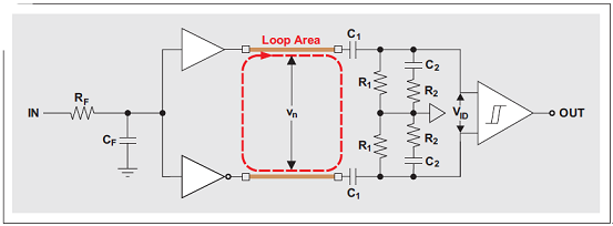 電容隔離器由兩塊硅芯片—一個發送器和一個接收機組成(請參見圖 2)。數據傳輸在由兩個電容構成的差動隔離層之間進行,在每個電容的二氧化硅 (SiO2) 電介質兩端都有一塊銅頂片和一個導電硅底片。發送器芯片的驅動器輸出通過一些接合線連接到接收機芯片上隔離電容的頂片。通過將電容的底片連接接收機輸入構成了一個導電環路。圖 3 顯示了隔離層的等效電路結構圖,并標示出了金接合線之間的環路區域。很明顯,穿過該環路的磁場將會產生一個 EMF,其表示下面 RC 網絡的輸入電壓噪聲 Vn1。我們常常碰到的第二種差動噪聲部分 Vn2,其產生原因是共模噪聲到差動噪聲的轉換。兩個噪聲分量共同組成了綜合噪聲 Vn。如果只考慮 EMF 的影響,則可以保守地將 Vn 一分為二: