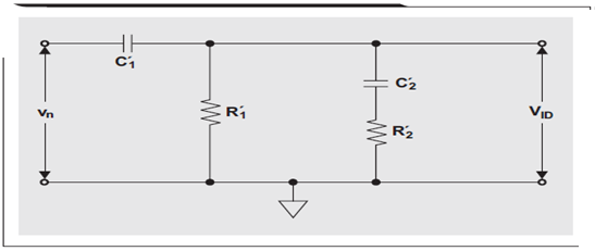 一次電路仿真證實了 RC 網絡為一個一階高通濾波器,其 C′1 和 R′1 為主要組件,頻率高達 100 MHz(參見圖 5 中藍色曲線)。超出這一頻率以后,寄生組件 C′2 和R′2生效,從而引起稍稍偏離于線性的斜率。因此,頻率達到 100 MHz 以后,增益響應可以表示為 VID/vn 的比: