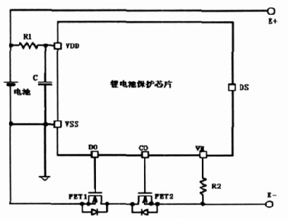 鋰電池保護電路的原理圖如圖1 所示, E +和E - 端之間加充電器或負載。電路工作原理如下: