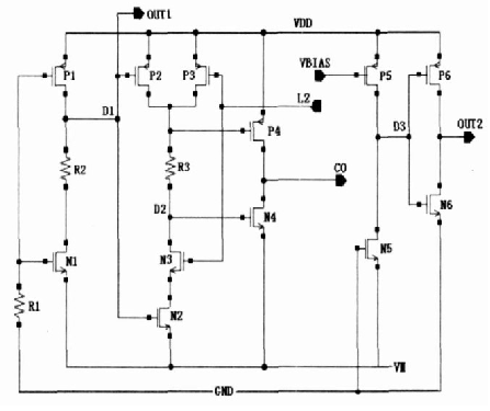 圖3就是符合此要求的帶隙基準源。在該電路中, P4, P5, P6, P7,N3,N4, N6組成一個二級運放作為基準源的反饋,而運放的偏置電壓由基準源來提供,既簡化了電路與版圖,又減少了額外功耗。通過調節MOS管的尺寸,使運放具有較高增益,較低失調電壓。基準源采用級連二極管的形式, Q1, Q2發射區面積相等, Q3, Q4發射區面積相等,為了減少功耗,取Q3的面積為Q2的兩倍。級連二極管形式能有效減少運放失調對輸出基準電壓精度的影響。