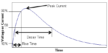 系統(tǒng)所經(jīng)歷的電氣應(yīng)力是各種各樣的: 有納秒上升時(shí)間且持續(xù)數(shù)以10計(jì)的安培電流的靜電放電(ESD)應(yīng)力;有微秒上升時(shí)間且持續(xù)數(shù)以萬計(jì)的安培電流的閃電應(yīng)力。對可以想到的現(xiàn)實(shí)世界中的每一種應(yīng)力都進(jìn)行產(chǎn)品測量是不可能的。所以標(biāo)準(zhǔn)機(jī)構(gòu)制定了針對每個(gè)特定的應(yīng)力威脅制定了專門的測試標(biāo)準(zhǔn)。這些標(biāo)準(zhǔn)以電壓和電流波形的形式來表示應(yīng)力。最常見的一種應(yīng)力波形就是圖示的雙指數(shù)波形。典型的電壓波型是被理解成開路,而典型的電流波型是被理解為短路。通常一個(gè)波形的參數(shù)包括峰值電壓、峰值電流、上升時(shí)間(通常是峰值時(shí)間的10%到90%)以及衰減時(shí)間(峰值時(shí)間的50%)。標(biāo)準(zhǔn)同樣規(guī)定了如何把應(yīng)力波形應(yīng)用到實(shí)際的被測試的設(shè)備以及通過或者未通過測試的準(zhǔn)則。這就確保了測試結(jié)果可以被任何一個(gè)做此種測試的人重現(xiàn)出來,并且通過這個(gè)測試的系統(tǒng)可以可靠地工作。