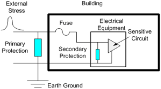 初級和次級保護(hù)的應(yīng)用非常普遍。這個(gè)概念在電信產(chǎn)業(yè)中用于閃電和浪涌保護(hù),也在先進(jìn)集成電路技術(shù)中做靜電放電(ESD)保護(hù)。初級的保護(hù)元件較貼近應(yīng)力源,主要目的是用于承受大部分的電流應(yīng)力,而次級保護(hù)元件則非常貼近敏感的電路元件,在最需要的地方提供保護(hù)。