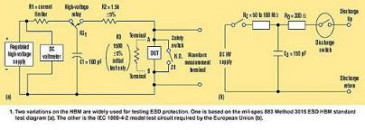 最流行的HBM變種是國際電工委員會IEC1000-4-2標準,定義為150pF電容通過一個330Ω電阻放電(圖1b)。這是歐盟對在其區域內商品銷售所必須的國際測試?! ?br />
