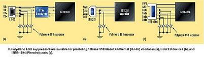 另外,商業化產品要求在所有不同的硬件接口位置都要有ESD浪涌保護。例如,一些新型電腦和更高端的消費電子可能會如下這些互連器件的大部分或者全部:以太網、USB1.1/USB2.0、IEEE-1394/1394b、音頻/視頻/RF以及傳統的RS-232、RJ-11等端口等的audio/video/RF端口。所有傳統的保護器件都已經不同程度地得以成功應用。但是,如今不斷增長的工作頻率為超低電容器件(如聚合物抑制器)提出了需求(圖2a)。