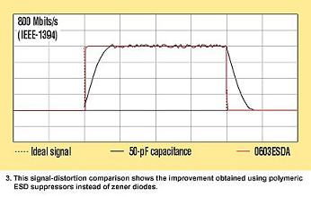 另外,許多新型消費電子器件能執行快速的IEEE-1394/1394b(Fireware)數據轉換協議。這種非常高的數據速率(1600 Mbps,1394b)要求低電容ESD抑制器,例如聚合物浪涌器件(圖 2c)。測試數據表明,聚合物ESD抑制器帶來的信號失真比硅二極管器件保護Firewire端口產生的更少(圖 3)。